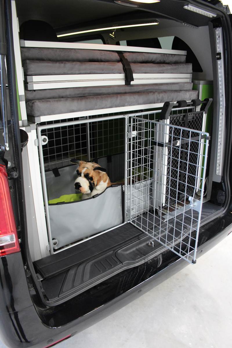 Composée d’aluminium et de matériaux composites légers, les compartiments s’adaptent à tous les gabarits d’animaux. Une version sur toute la largeur pour un grand chien, divisée en deux pour deux chiens plus petits, ou utilisée sur une seule moitié pour permettre le stockage de bagage, de vélos, ou d’un siège supplémentaire. La circulation du chien est facilitée par des portes d’accès intérieure et extérieure. Tout a été pensé pour le confort de nos amis canins : une rampe d’accès pour faciliter l’accès à l’arrière, des revêtements protecteurs, des sangles d’arrimages, des crochets pour fixer les laisses, etc.