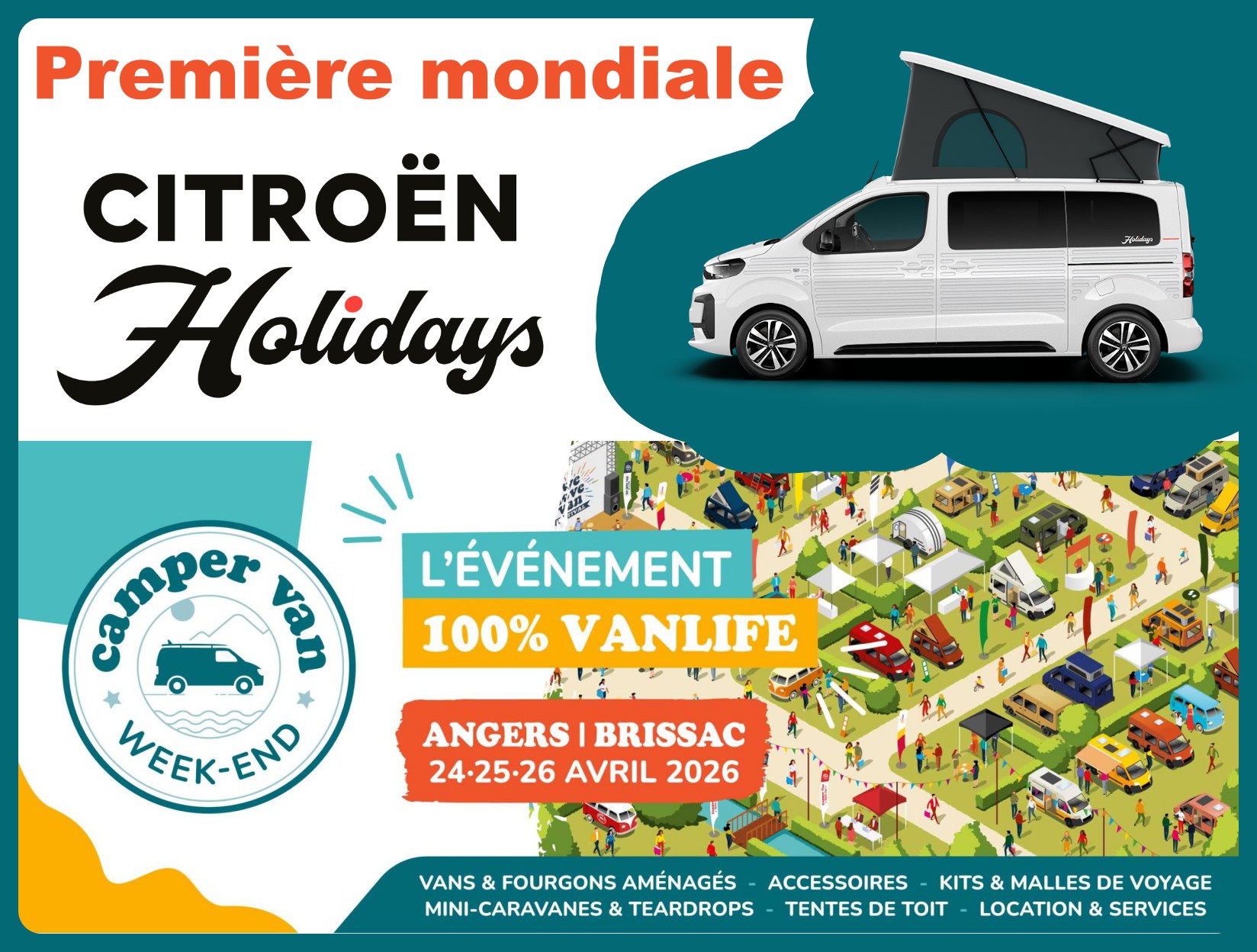 ✅ Découvrez le Citroën Holidays au Camper Van Week-End, dont Citroën est partenaire exclusif, l’évènement se déroulera à Brissac-Loire-Aubance (49), les 24, 25 et 26 avril 2026. Entrée libre sur réservation. Parking ou bivouac payants, tarifs préférentiels en ligne.