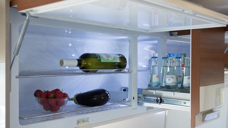 Ce réfrigérateur à compresseur est installé dans un meuble haut du fourgon Vantana. Le groupe réfrigérateur d’une largeur de 1,40 mètre offre une capacité de 90 litres et s’intègre pour ainsi dire sans démarcations à la partie avant du mobilier. Ce réfrigérateur est la combinaison astucieuse et heureuse du design et d’une technique moderne.