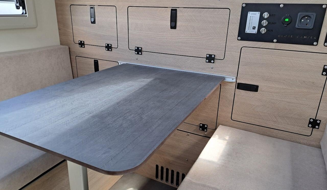 Parmi les nouveautés de Cellules Touareg, l’Optima 2023, un modèle à capucine sous toit rigide à fixer sur le plateau ou la benne du pick-up. Elle se distingue par son format – plus étroit – et son équipement : batterie Lithium 100Ah, panneau solaire 115W, régulateur MPPT, chauffage/chauffe-eau Truma Combi D4 associé à un réservoir de gasoil indépendant de 15L. Les grands voyageurs peuvent se passer totalement du gaz en retenant la plaque à induction et le convertisseur 3000W.