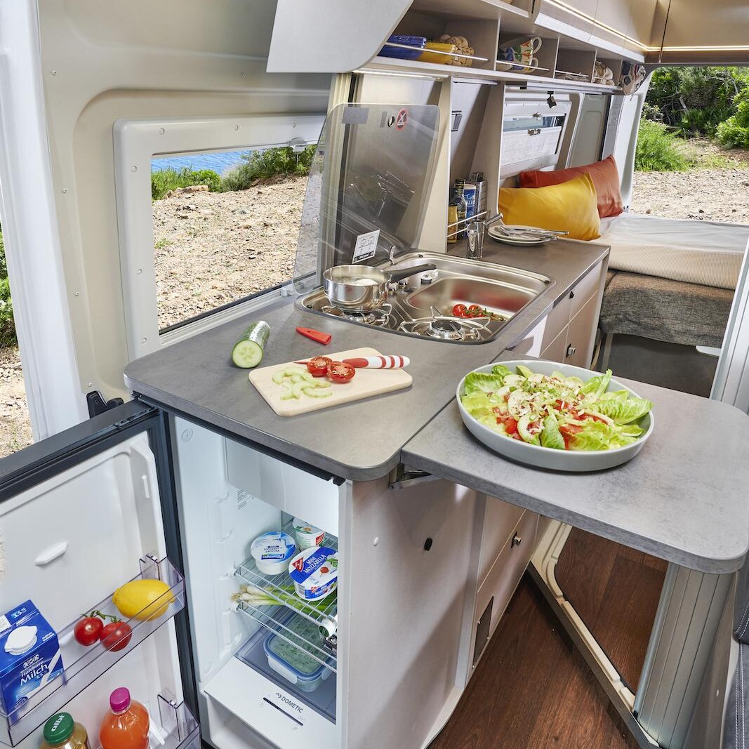 Avalanche de nouveautés sur le stand Crosscamp. Aux côtés du van Flex déjà connu, vous retrouverez les nouveaux fourgons Flex 541 et Full 600 ainsi que le minivan Base X sur Mercedes Vito fraîchement révélé. Le Flex 541 mérite une attention particulière de par son aménagement ultra-modulable : canapé clic-clac, douche amovible, cuisine en partie extractible, etc. Prix de départ : 53.499 € (sièges coulissants et toit relevable en option).