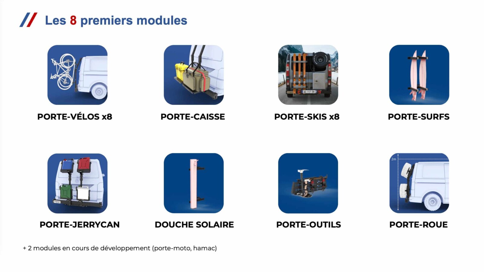 Rappelons-le, le Jacquard c’est un porte-matériel 100% modulable et pivotant, qui vient se fixer à l’arrière des vans et fourgons, sans contraindre l’ouverture des coffres et hayons. Une sorte de « galerie verticale », robuste et solidement fixée directement au châssis du véhicule. Ce système, homologué, breveté et fabriqué en France est aujourd’hui le seul produit sur le marché répondant à ces critères et mettant à disposition des modules permettant d’emporter plusieurs équipements à la fois : vélos, surfs, skis, roue de secours, etc…