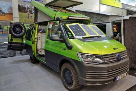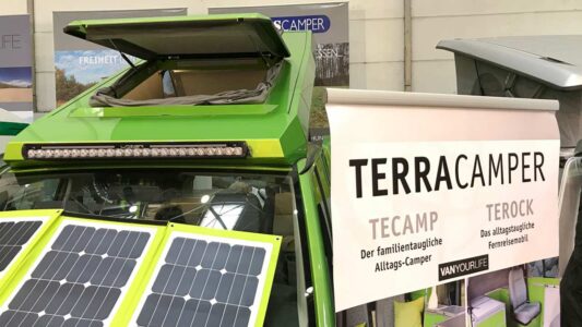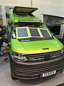 Ce toit est à l’œuvre sur le modèle Terock à transmission intégral aménagé sur base VW T6 par Terracamper. Un fourgon clairement destiné aux grands voyages et à une pratique off-road sur terrains hostiles, ce qui dédouane sa hauteur de 2,25 m peu compatible avec l’accès aux parkings urbains.