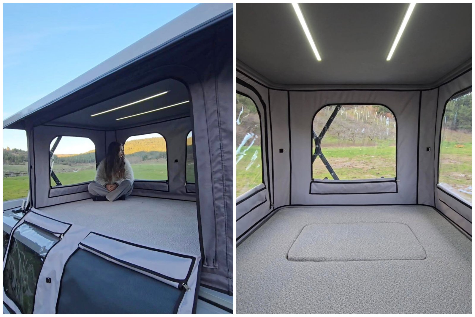 Sur le segment du van, le grand toit s’ouvrant à la verticale était jusqu’ici la chasse gardée de JCG Créations. Proposé sur les aménagements V7, son toit électrique à parois rigides permet d’augmenter la hauteur sous plafond dans tout l’habitacle, en même temps qu’il confère une isolation phonique et thermique bien supérieure à un toit à parois entoilées. Il offre, en outre, une robustesse et une résistance accrue aux aléas météorologiques. Mais il n’est pas exempt de défaut puisque, contrairement aux modèles cités plus haut, il n’offre pas de couchage supplémentaire à l’étage. L’artisan Limouzine Van, avec son prototype de toit à soufflet, a tenté de combiner ce type de relevage avec un grand couchage à l’étage. Mais le projet est resté confiné au stade du concept… Le toit à parois gonflables pour VW T6, développé conjointement par SCA et la start-up X Gloo en 2023, est lui aussi resté dans les cartons.