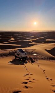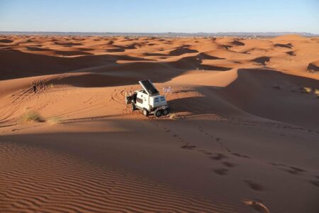 Le van s’équipe par ailleurs d’un porte-charge hydraulique à l’arrière, accueillant deux roues de secours mais pouvant aussi recevoir une petite moto (250 kg max de charge). L’installation électrique, enfin, intègre, une batterie lithium (240 Ah), un panneau solaire (240W) et un convertisseur 3000 W. De quoi conférer une excellente autonomie au véhicule lors du périple… Un périple qui ne fait que commencer : après le Maroc et la Mauritanie, Pajwagen arpente actuellement les pistes et dunes du Sénégal.