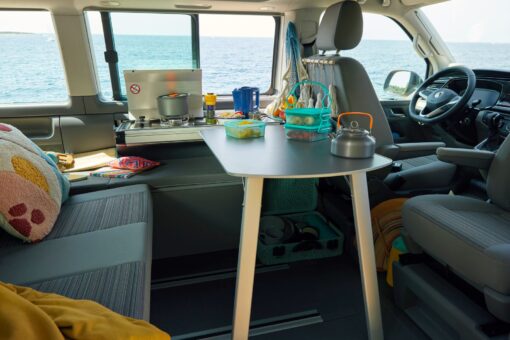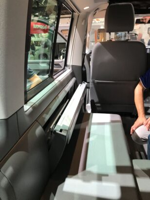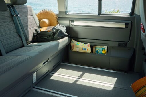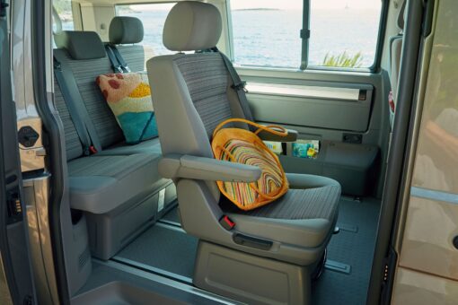 Changement aussi du côté de la banquette, alors que le Coast et l’Ocean sont proposés avec une banquette deux places en raison de la largeur plus importante de la cuisine, le California Beach Camper 6.1 peut être commandé avec une banquette trois places en option (deux places de série), grâce à sa mini-cuisine escamotable. Cette nouveauté offre pour la première fois la possibilité d’embarquer 5 passagers à bord du California, avec une cuisine à bord. Le Beach Tour est aussi disponible en 6 ou 7 places, avec des sièges pivotants sur la 2ème rangée.