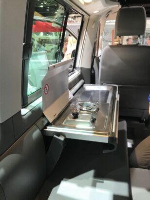 À la différence des grands blocs cuisine installés dans les versions California Coast et Ocean, le Beach Camper bénéficie d’une mini-cuisine innovante et design. Elle comprend un petit réchaud gaz, prolongé par une plateforme inox, mais pas d’évier…