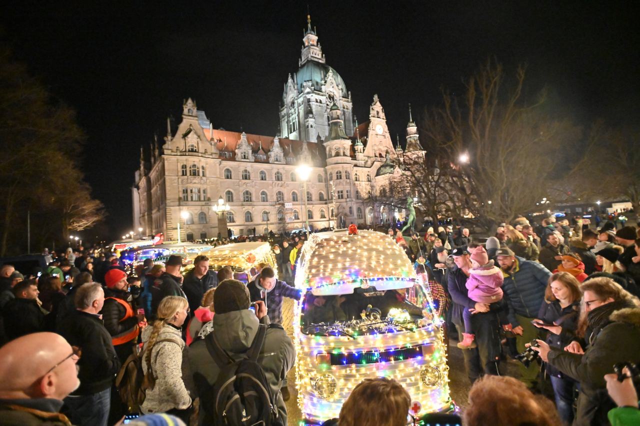 Au milieu du long cortège de véhicules, VW présentait plusieurs modèles historiques décorés de plus de 2500 ampoules LED. Il s’agissait d’un T1 Samba (1963), d’un double cabine T1 (1966), d’un camion de transport T1 (1964) et d’un Multivan T6.1 actuel. Les participants sont venus de toute l’Allemagne, mais aussi des Pays-Bas et de Suisse pour participer à cet événement festif.