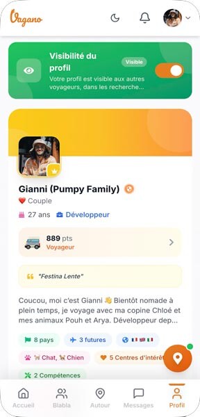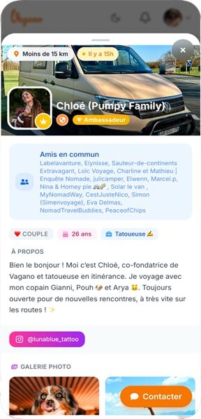 Imaginez… Vous faites étape sur un spot sympa et vous êtes d’humeur à sociabiliser. Envie de boire un café en bonne compagnie, d’une soirée jeux de société ou encore de partager vos dernières aventures dans le coin. Seul hic, personne à la ronde. Pas grave ! Vous ouvrez votre appli Vagano, vous repérez les voyageurs qui se trouvent à proximité de vous et vous leur envoyez un message pour leur proposer de se joindre à vous.