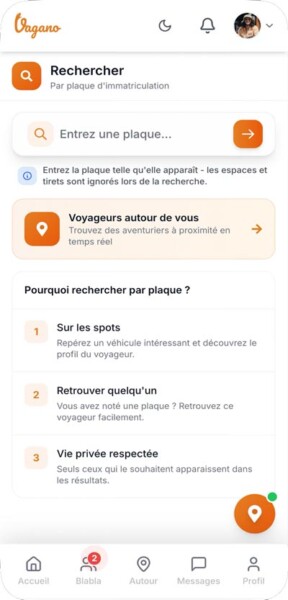 Imaginez encore… Vous repérez un van dans le coin, vous êtes d’humeur à sociabiliser mais, par timidité ou par crainte de troubler la quiétude de ses occupants, vous n’osez pas aller taper au carreau. Toujours pas grave ! Vous ouvrez votre appli Vagano et vous saisissez la plaque d’immatriculation du véhicule repéré. Si ces voisins font partie de la communauté, vous pouvez entrer en contact avec eux en leur envoyant un message.