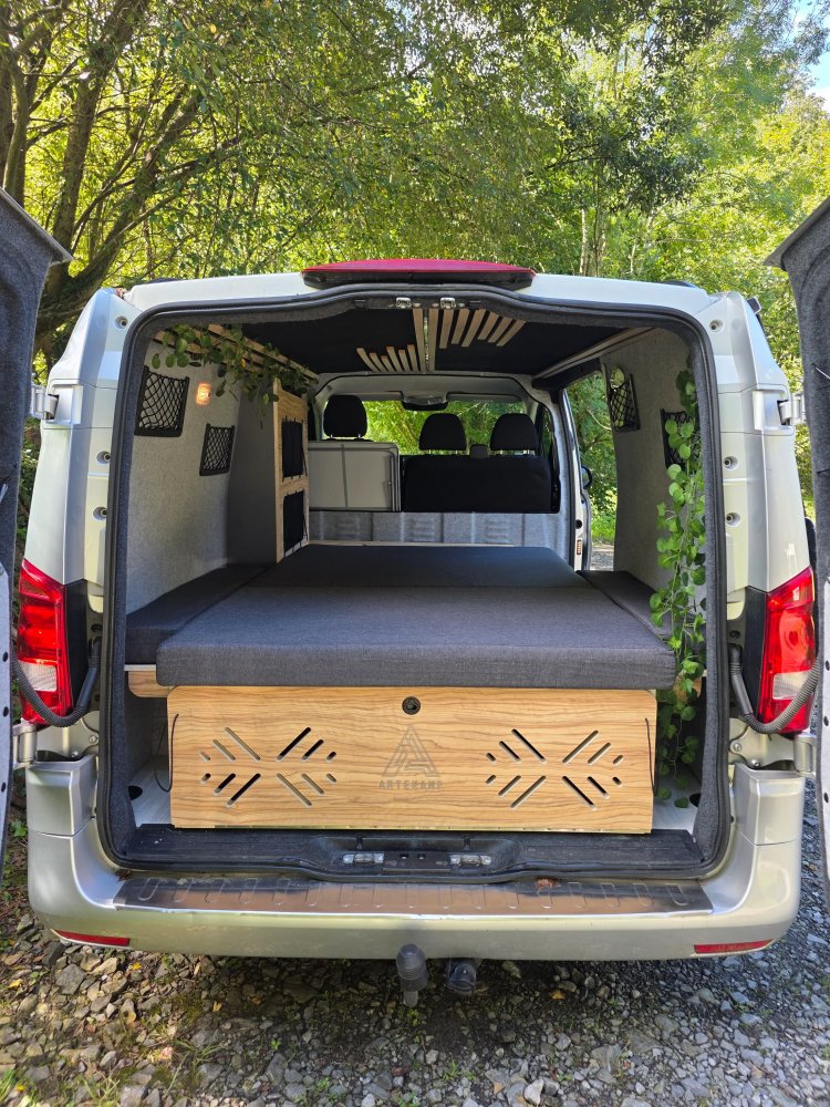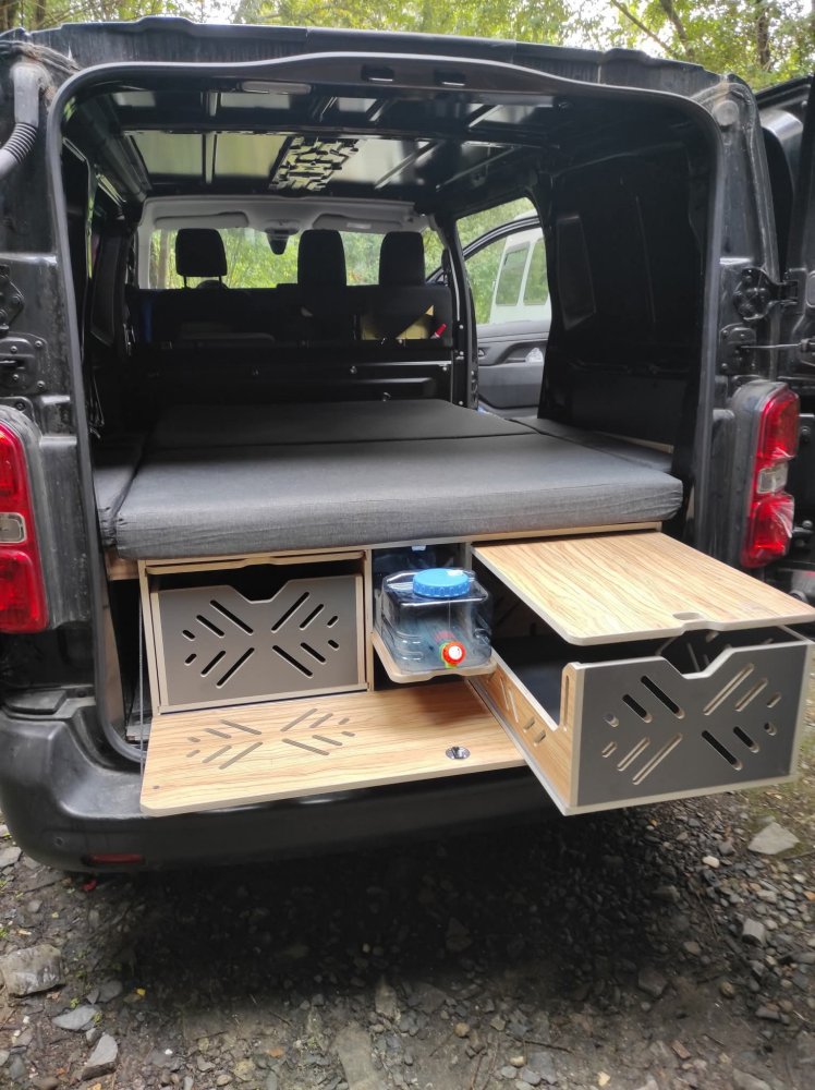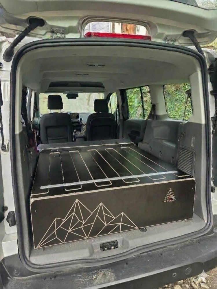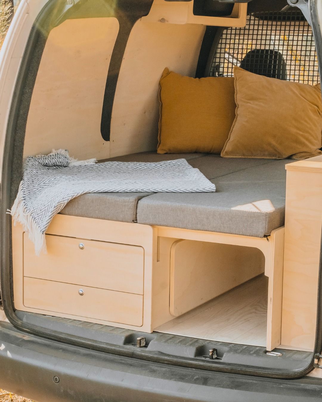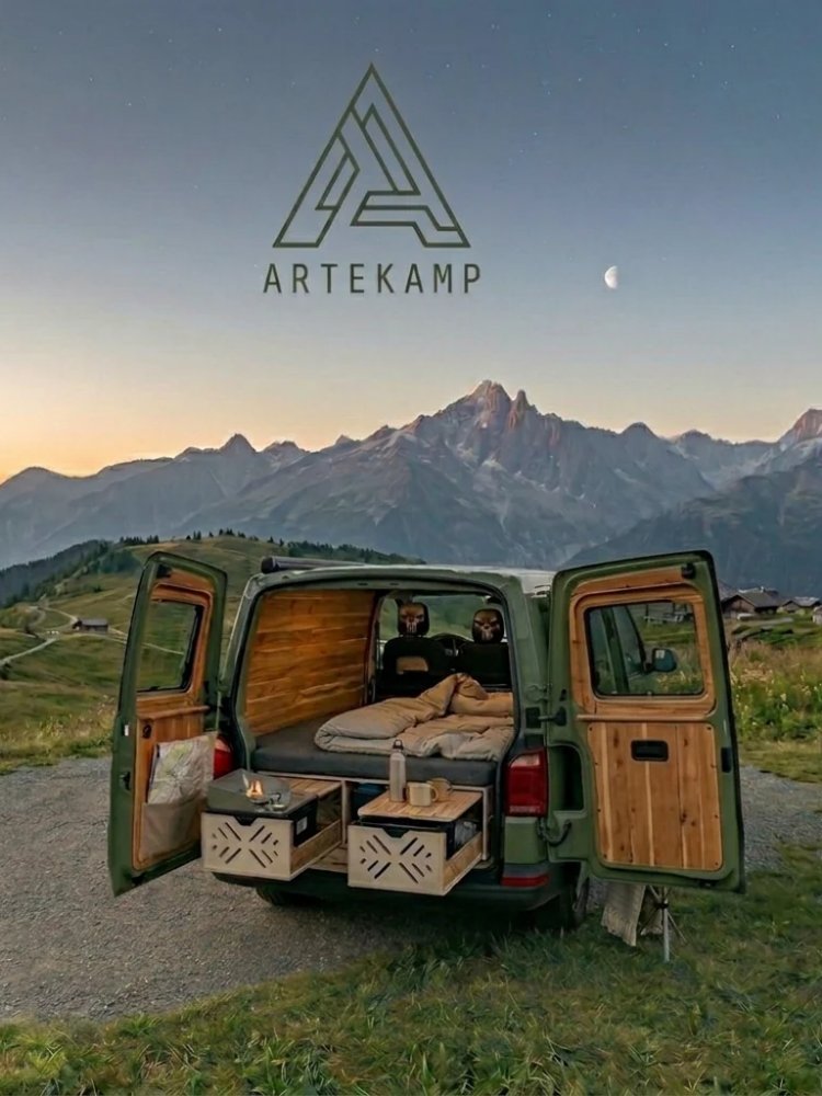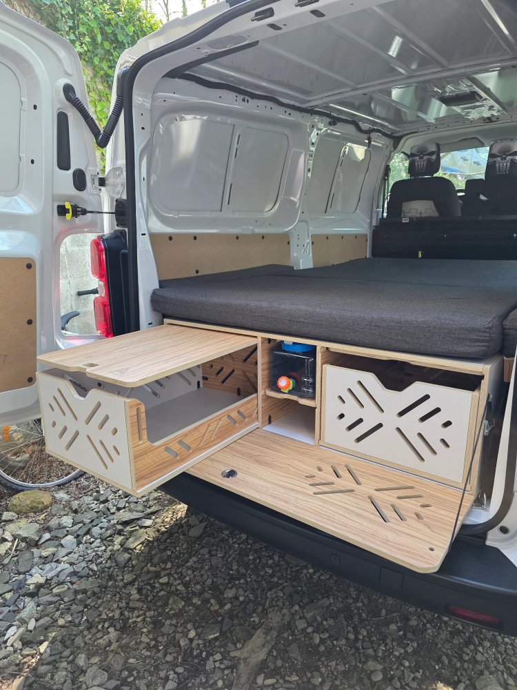 Ex-Ma Cabane à roulettes, Nicolas Yriarte a fait le choix de se spécialiser dans des modules amovibles type malle de voyage sous le nom d’Artekamp. Installés dans le coffre d’un van ou d’un ludospace, ils intègrent un couchage double et des volumes de rangement plus ou moins sophistiqués selon le niveau de gamme. De quoi transformer son véhicule en véhicule de loisirs en deux temps trois mouvements et à partir de 890 €.