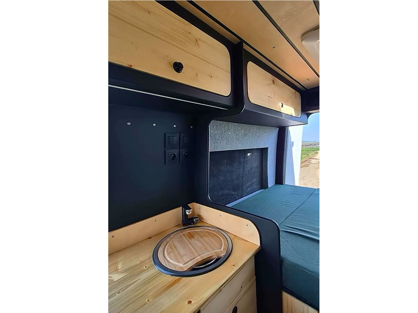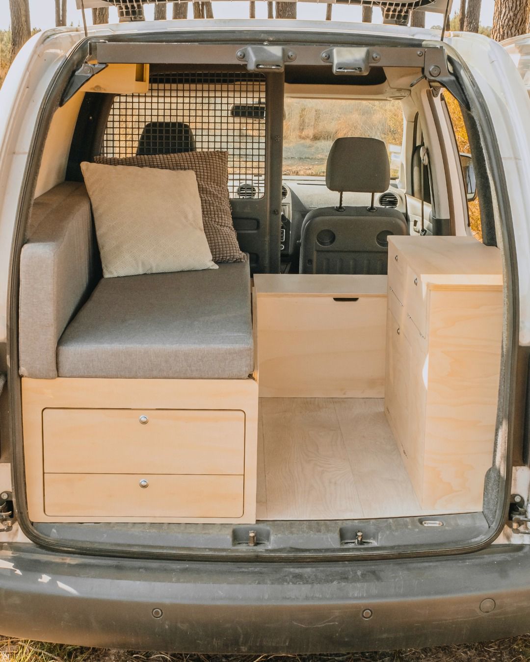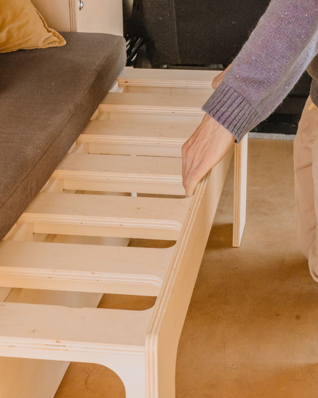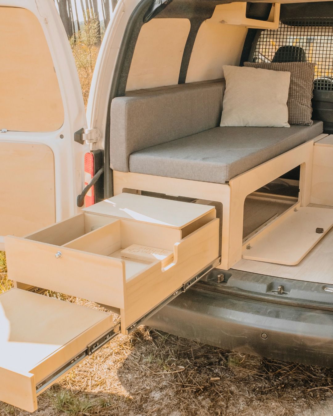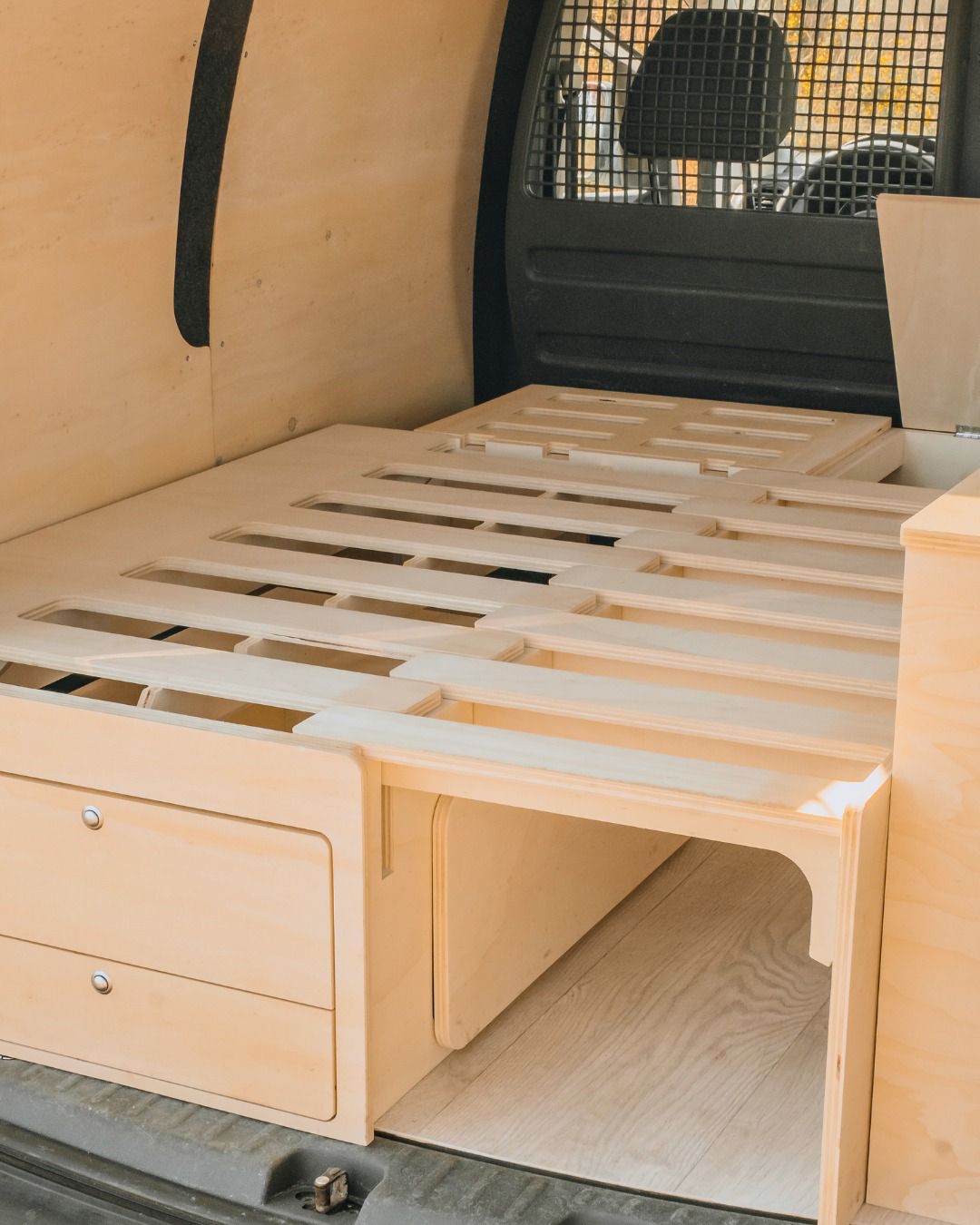Simple Vans conçoit des kits d’aménagement à assembler soi-même – kits complets ou meubles à l’unité – pour tous les types de véhicules, du ludospace au grand fourgon en passant par le van. Leur promesse : des kits tellement simples à monter qu’ils peuvent être installés par « n’importe qui », même les bricoleurs du dimanche, avec pour seule condition de s’équiper d’une visseuse, de colle à bois et de ruban adhésif ! Conçus en contreplaqué de peuplier brut, ils peuvent être laissés en l’état ou personnalisés par vos soins (peinture, huile).