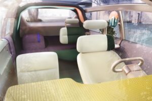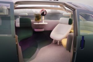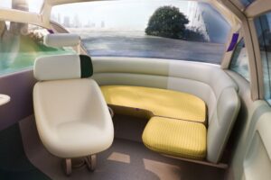 L’intérieur du Vision Urbanaut s’apparente à un véritable lounge mobile. Avec 3 « moments » proposés à bord : Wanderlust, Chill et Vibe. Le premier est centré sur l’expérience de conduite. Le conducteur peut au choix prendre le volant ou céder sa place à un système de conduite autonome. Dans ce cas, les organes de commandes se rétractent dans la planche de bord et cette dernière peut s’abaisser pour se transformer en banquette ou lit. On retiendra ensuite le mode Chill pour se relaxer ou télé-travailler. Une arche digitale, simulant une canopée, se déploie alors au-dessus de la méridienne arrière. Les fauteuils peuvent être rétractés ou pivotés à l’avant. Enfin, on switchera sur le mode Vibe pour partager un moment convivial avec les amis ou la famille. Dans cette configuration, la porte d’entrée coulisse automatiquement, tandis que le pare-brise se relève. Comme un clin d’oeil au vieux VW Combi Split Window.