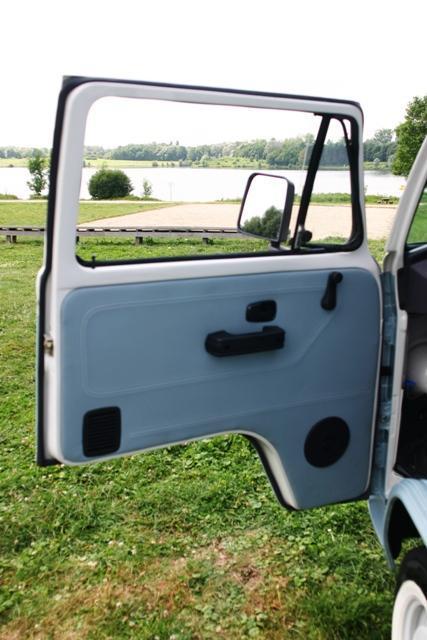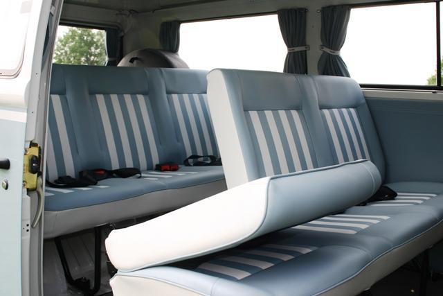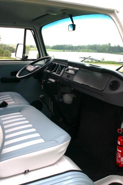 Le Combi Last Edition est un Combi 9 places. Les sièges sont recouverts de skaï bicolore bleu et blanc à rayures. Les panneaux intérieurs, panneaux de portes et de l’espace de chargement sont habillés de vinyle bleu avec surpiqûres. Le plancher de l’habitacle et du coffre est recouvert de tapis avec inserts gris, la même matière que pour la housse de roue de secours. L’habitacle se pare de rideaux en tissu avec une lanière d’attache siglée avec le logo « Combi » brodé comme dans les années 1960 et 70. Une plaque en aluminium brossé indiquant le numéro de série de chacun des exemplaires orne le tableau de bord. Le nôtre est le 262/1200. Un exemplaire unique en France, propriété de Volkswagen Utilitaires France. Car le T2 Last Edition n’est pas homologué en Europe et ne peut pas être immatriculé. Côté équipements de confort, le T2 possède une lunette arrière dégivrante, un allume-cigare, un affichage digital du kilométrage, une ventilation d’air pour les aérateurs (il n’y a pas de chauffage), de ceintures trois points, de sièges avant avec appui-têtes, une minuterie pour les essuie-glaces, des feux de détresse et un autoradio MP3 avec prise USB, seule concession à la modernité. L’ensemble fleure bon les véhicules anciens malgré le fait que ce Combi est flambant neuf.