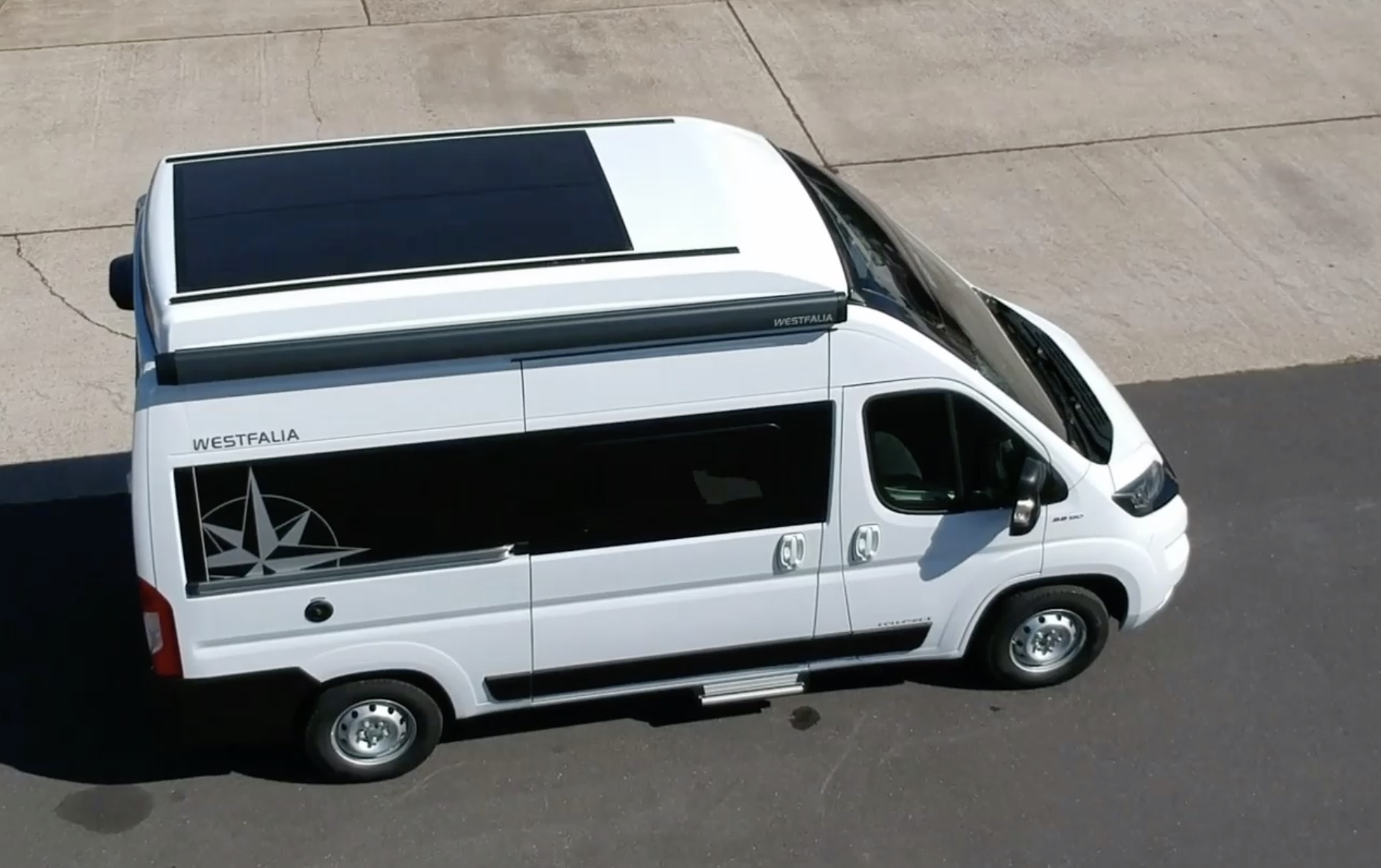 Westfalia en Allemagne reprend l’initiative et présente en exclusivité un panneau solaire de grande dimension, souple et léger (10 kg), pour les toits relevables. Il sera proposé en option sur les trois fourgons Westfalia Columbus, la référence haut de gamme sur Fiat Ducato. Le prix n’est pas encore connu.