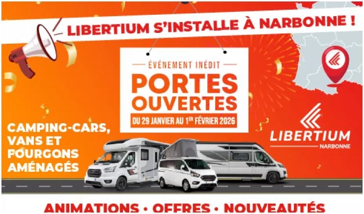 Pour fêter l’ouverture de ce nouveau point de vente, la concession Libertium Narbonne organise ses portes ouvertes du 29 janvier au 1er février. Les visiteurs pourrons découvrir sur le parc de plus de 7000 m2, les marques Challenger, Eden Camp, Font Vendôme, Notin, Panama et Rimo. Camping-cars, fourgons et vans aménagés neufs, mais également une sélection de modèles d’occasion.
