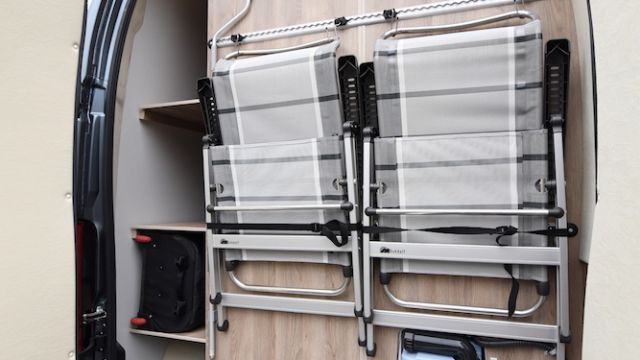 Sur l’Avanti H, La Strada tire avantage de la haute silhouette du Fiat Ducato H3 (2,89 m) pour aménager un vrai double plancher qui couvre pratiquement l’intégralité du fourgon (hors salle d’eau) et abrite de multiples rangements compartimentés et accessibles uniquement depuis l’intérieur du véhicule. En d’autres termes, aucun ne communique avec la soute à l’arrière. Pour les objets longs et de faibles épaisseurs (15 cm), de type skis et cannes à pêche, on pourra les suspendre le long de la paroi sur des rails en option. Au final, et contre toute attente, cet espace arrière compartimenté comprend des solutions variées et plus nombreuses qu’il n’y parait.