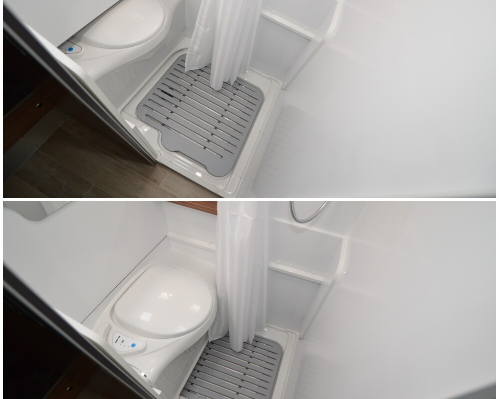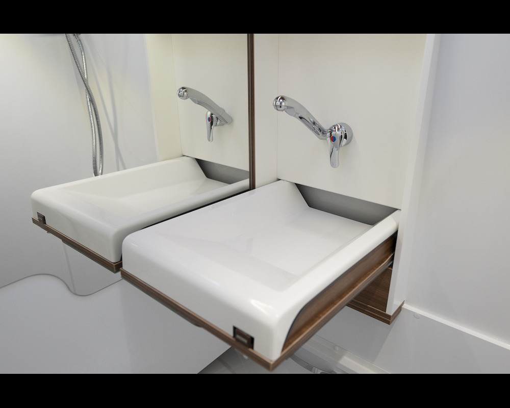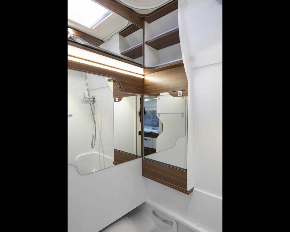 Le V630 J s’illustre aussi par sa salle de bain fonctionnelle : s’il ne retient pas de paroi pivotante, solution convaincante à l’œuvre par exemple chez Adria ou Elios, il intègre plusieurs astuces pour optimiser au mieux l’espace. Ainsi, la vasque – quand elle n’est pas utilisée – se rabat contre la paroi tandis que le WC peut coulisser sur 20 cm environ et libérer de la place pour la douche. Simple et efficace. Souple, le rideau de douche ne colle pas pour autant à la peau car Pilote a eu la bonne idée de ne l’installer que d’un côté du cabinet de toilette, là où sont réunis rangements et miroir. C’est bien vu.