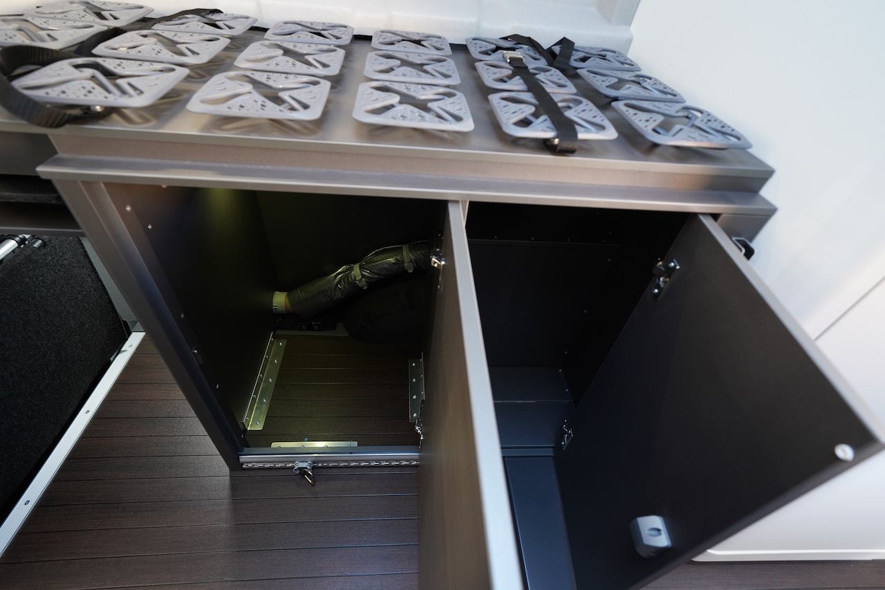 Régulateur adaptatif de distance ACC, point d’accès WI-FI avec une carte SIM personnelle, bac de charge inductif, assistant de stationnement Park Pilot, détecteur d’angle mort, correcteur de trajectoire en cas de vent latéral, panneaux solaires sur le toit (104 W), éclairage d’ambiance à couleur réglable, porte-vélos AR sur porte, système satellite pour réception TV, climatiseur de toit.