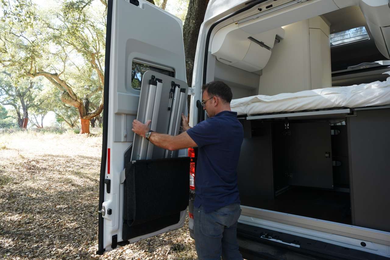 - Les 2 chaises pliantes et table de camping pour l’extérieur intégrées au véhicule