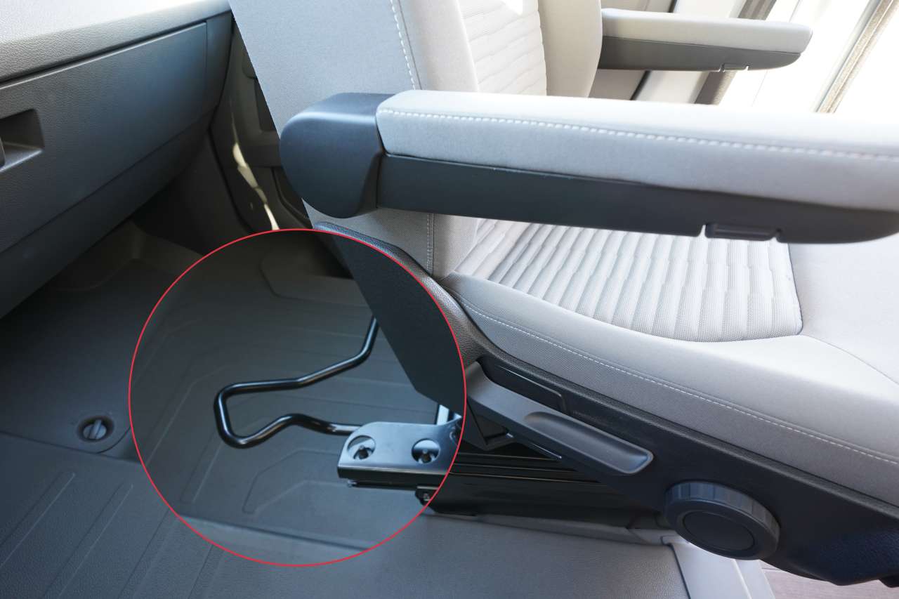 Autre détail remarquable, le portillon d’accès à la cassette WC. Discrètement intégré, il épouse par ses formes le dessin de la carrosserie du VW Crafter. Ce développement inédit et coûteux éloigne le Grand California du monde du camping-car.