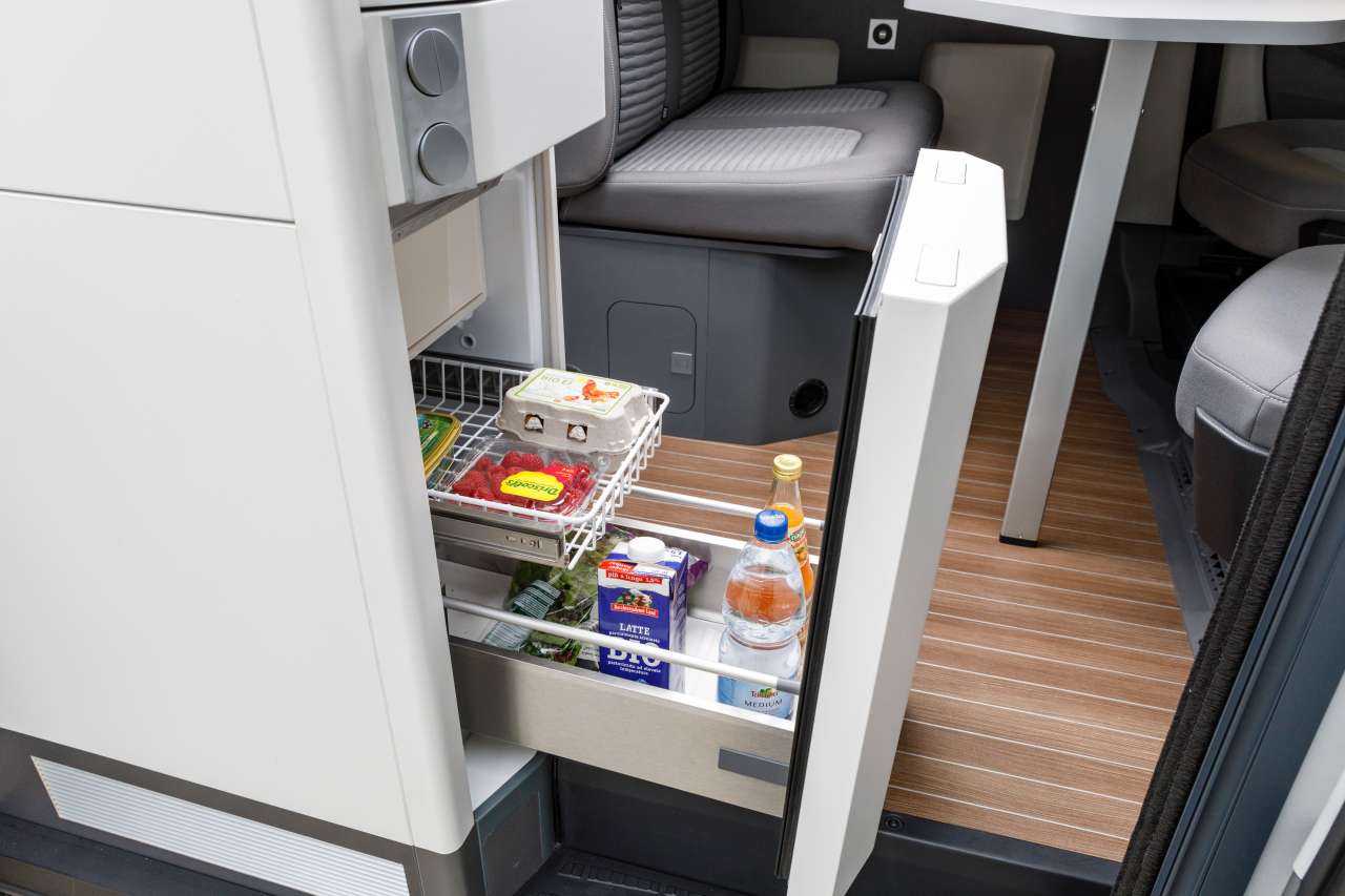 Sur le Grand California, Volkswagen retient le puissant Combi 6 E qui fonctionne selon trois scénarios possibles : gaz pour des étapes en totale autonomie, électricité (900 W ou 1800 W) lors d’un arrêt au camping à la belle saison, ou mixte durant l’hiver. En complément du 230 V, le brûleur gaz est activé en cas d’exigence momentanée. Besoin de puissance.