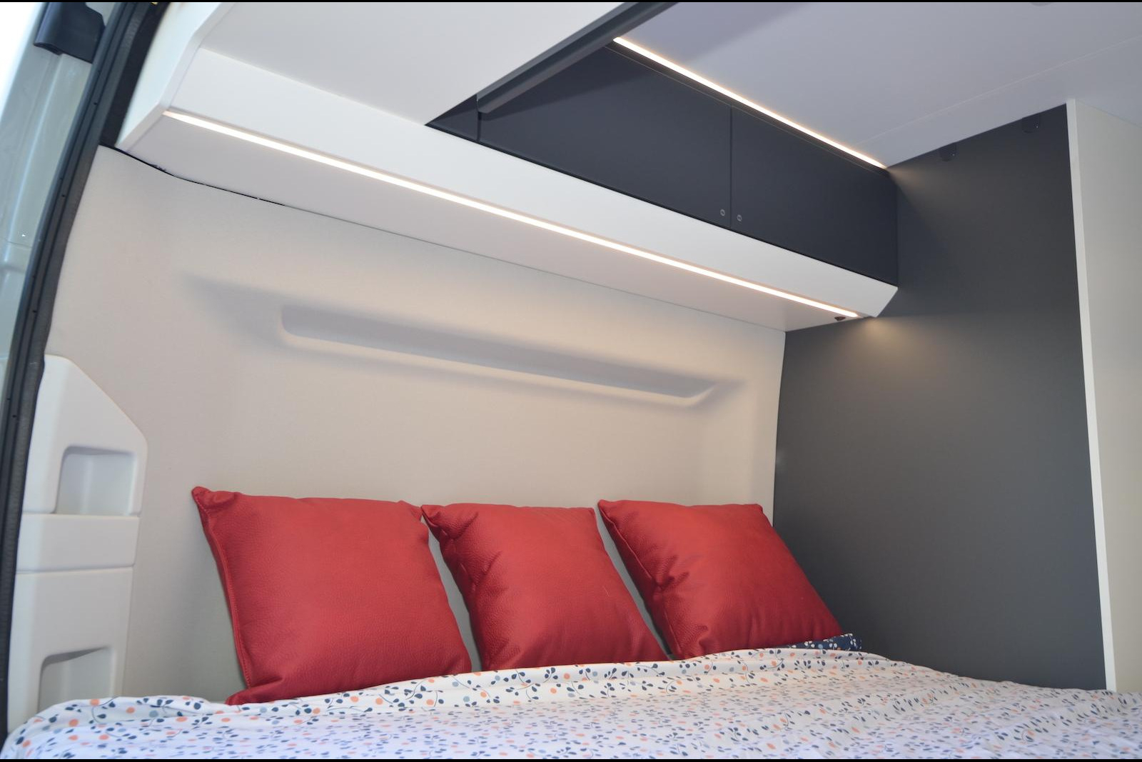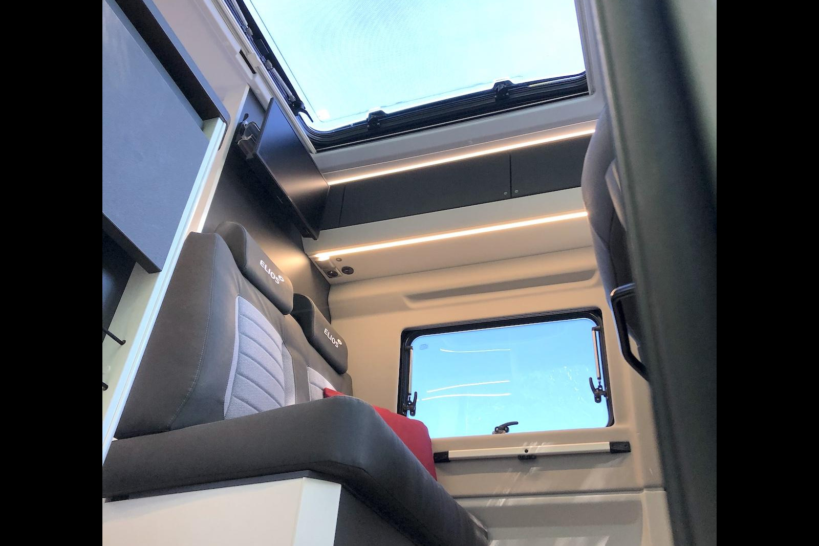 Alors qu’il est désormais un équipement relativement courant sur nos voitures, le toit panoramique était jusque-là absent du segment du fourgon aménagé. Enfin, pas totalement, puisque – vous le savez – nombre de fourgons adoptent déjà un toit vitré en cabine. Mais pour 2023, Elios va plus loin et se rapproche des standards automobiles, en prolongeant ce « skyroof » d’un maxi lanterneau surplombant le salon. La prouesse est d’abord technique. Car à l’inverse du lanterneau d’origine (90 x 60 cm) qui coiffe le salon, ce toit dôme optionnel affiche des côtes hors-norme de 110 x 85 cm. Ce qui implique une découpe du toit bien plus importante que la trémie d’un toit relevable. Une découpe qui touche aux traverses structurelles de la carrosserie, mais « le cadre du Sunroof XL est conçu pour prendre le relais« , précise Elios.