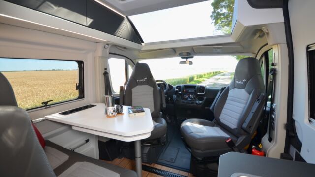 Disponible sur Fiat Ducato ou Citroën Jumper, l’Elios Skyline 59 T se positionne sur un segment moyen-haut de gamme. Pour 2023, comme toute la gamme à laquelle il appartient, le modèle peut s’équiper d’un immense lanterneau au-dessus du salon (en option), inscrit dans le prolongement de la fenêtre surplombant la cabine (de série). Avec ce « Sunroof XL », le salon s’ouvre comme jamais sur l’extérieur !