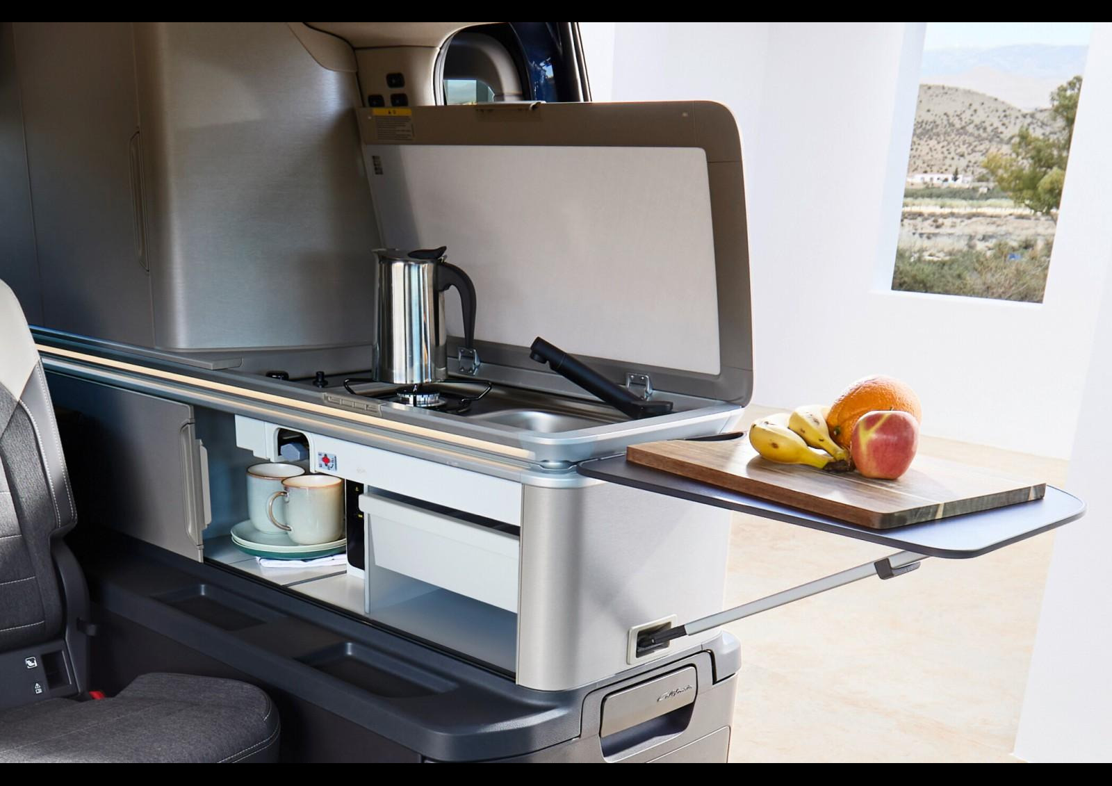 Cette seconde porte coulissante a obligé VW à remanier profondément l’aménagement intérieur de son California. Le principal perdant, c’est la cuisine, dont le meuble a sérieusement été raccourci par rapport à la précédente génération (65 cm de large pour 36 cm de profondeur). En guise de rangements, il faudra ici se contenter d’un range-couverts et d’une petite niche de 20-25 cm de haut. C’est franchement léger pour entreposer les denrées et ustensiles. Quant à la plaque de cuisson au gaz, attenante à l’évier, elle ne comporte plus qu’un feu contre deux auparavant. Avec ce rétrécissement de la cuisine, la position du réfrigérateur a également été revue. Prenant auparavant la forme d’une cuve accessible par le haut (via une porte sur le plan de travail), il migre désormais en partie basse du meuble et s’ouvre façon tiroir. C’est un bon point car il devient accessible aussi de l’extérieur. Autre point positif de ce dégagement de l’accès côté gauche : le siège conducteur peut désormais pivoter à 180° (après avoir ajusté le dossier), alors que sa rotation était auparavant limitée par le meuble cuisine.
