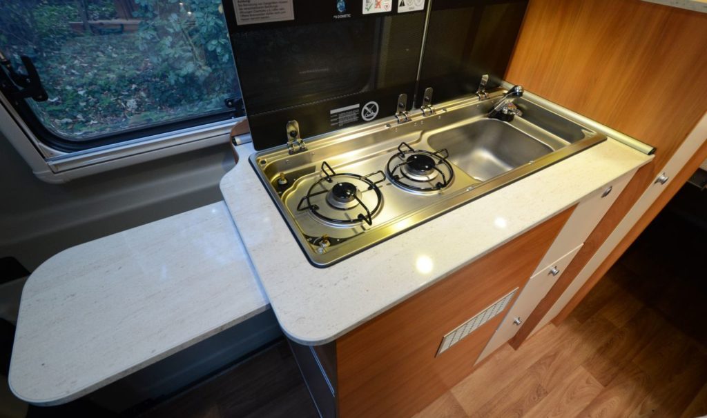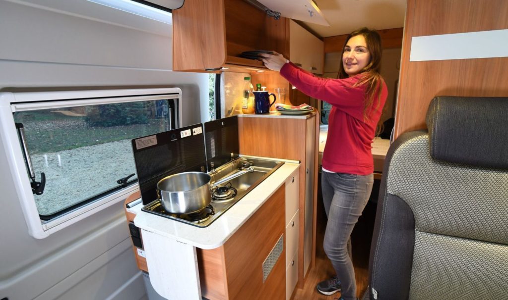 Privé de ses placards de pavillon le long des portes arrière, il gagne notamment une penderie étroite mais suffisamment haute (h. 110 cm) pour y ranger tout type de vêtement. Revers de la médaille, les tiroirs de la cuisine s’en trouvent réduits à la portion congrue (17 cm de largeur). On se tournera vers le placard haut ou ceux de la dînette pour la vaisselle et autres ustensiles, légèrement plus profonds, mais dans tous les cas on prévoira de s’équiper en conséquence.