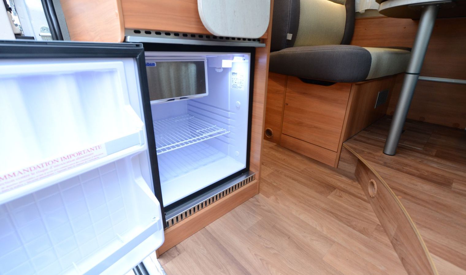 Placé au bout du bloc cuisine, façade du côté de l’entrée, le petit frigo à compression de 65 l est accessible aussi bien depuis l’intérieur que depuis l’extérieur et sa porte ne vient jamais empêcher la circulation de l’avant vers l’arrière du véhicule. Pratique !