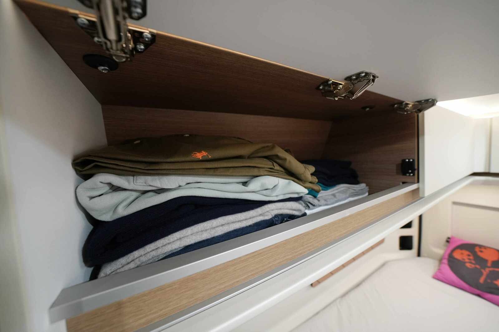 Bien que gourmande en place, cette configuration est appréciée pour son confort et sa facilité d’accès : libre à chacun d’aller et venir sans déranger l’autre. Un rideau d’intimité ferme de surcroit la vue sur la chambre. Étant donné la hauteur des couchages (80 cm par rapport au plancher), on pourrait supprimer la petite estrade en pied de lit, un obstacle de moins à la circulation, si elle ne servait pas d’appui à l’arrêt de charge. Bien sûr, le volume sous l’estrade sera mis à profit pour y glisser des objets longs dans une soute compartimentée par une étagère intermédiaire et amovible. L’ensemble de la soute technique est traité anti-chocs : protection du plancher en tôle d’alu et revêtement spécial sur les meubles. Tous les constructeurs n’en font pas autant !