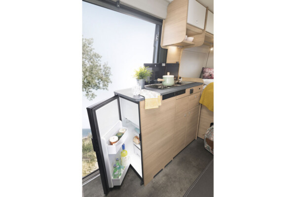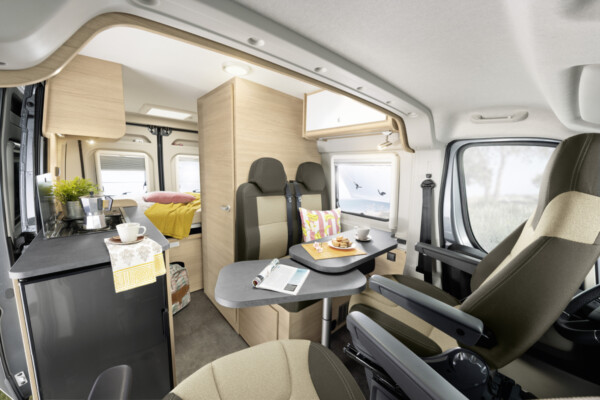 Côté équipement, le Roadcar R540 est désormais équipé d’un frigo 90 l avec position nuit – réduction du bruit et de la consommation –, d’un réchaud deux feux en cuisine et d’une nouvelle table plus large et plus stable, identique à celle d’un Pössl Roadcamp.