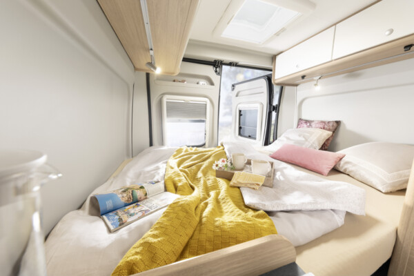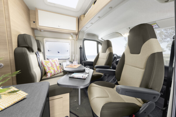 Le mobilier arbore de nouvelles lignes et le lavabo du cabinet de toilette se fait fixe plutôt que rabattable en même temps que le compartiment gagne en volume. On trouve également à son bord des spots et chargeur USB Dometic repositionnables sur rail.