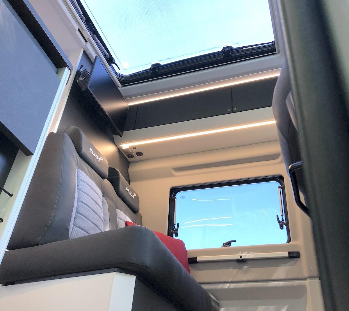 Alors qu’il est désormais un équipement relativement courant sur nos voitures, le toit panoramique était jusque-là absent du segment du fourgon aménagé. Enfin, pas totalement, puisque – vous le savez – nombre de fourgons adoptent déjà un toit vitré en cabine. Mais pour 2023, Elios va plus loin et se rapproche des standards automobiles, en prolongeant ce « skyroof » d’un maxi lanterneau surplombant le salon. La prouesse est d’abord technique. Car à l’inverse du lanterneau d’origine (90 x 60 cm) qui coiffe le salon, ce toit dôme optionnel affiche des côtes hors-norme de 110 x 85 cm. Ce qui implique une découpe du toit bien plus importante que la trémie d’un toit relevable. Une découpe qui touche aux traverses structurelles de la carrosserie, mais « le cadre du Sunroof XL est conçu pour prendre le relais« , précise Elios.