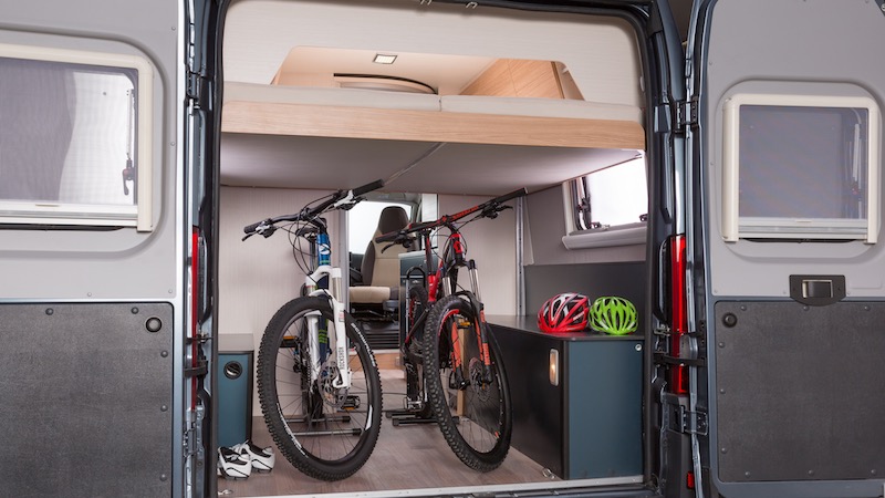 La personnalisation va plus loin. Sur les modèles 600 MQ et 630 ME, vous aurez le choix entre un cadre de lit fixe ou un sommier réglable en hauteur de manière à dégager le volume de soute (hauteur maxi 120 cm). C’est pratique dans le cadre d’une utilisation temporaire pour le transport de charges encombrantes. Par contre, dans cette configuration particulière, vous perdez l’usage du couchage double, plaqué pratiquement contre le plafond. Quoi qu’il en soit, le mécanisme du lit relevable permet de le positionner à la hauteur désirée, entre 75 cm et 120 cm du plancher.