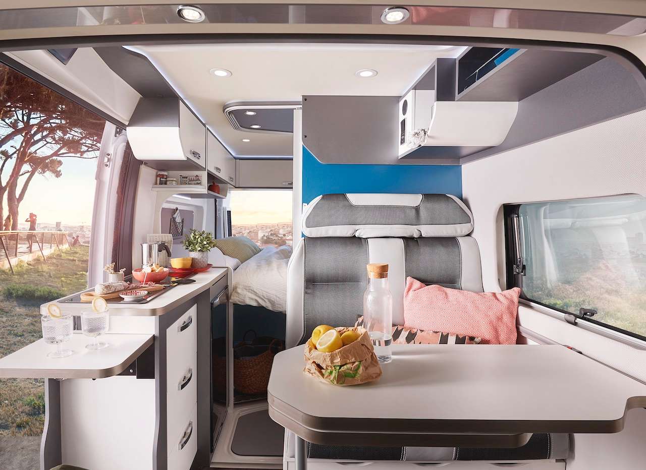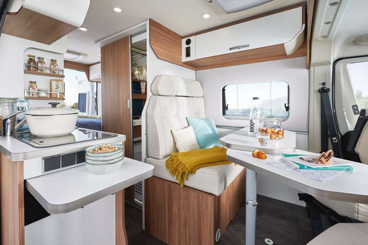 Moyennant un supplément de 2000 €, le Pilote V 600 G se présente dans une finition supérieure Premium, d’inspiration plus contemporaine, qui s’affranchit des tonalités bois de la version Standard. Cette finition convainc aujourd’hui un acheteur sur trois. Les évolutions ne s’arrêtent pas à la décoration, mais s’étendent aussi à l’équipement (spots encastrés sous les placards), au rétro-éclairage de pavillon, à la banquette Isofix, au mobilier, au revêtement de pavillon… Bref, un ensemble assez convaincant qui donne au Pilote V 600 G un supplément d’identité.