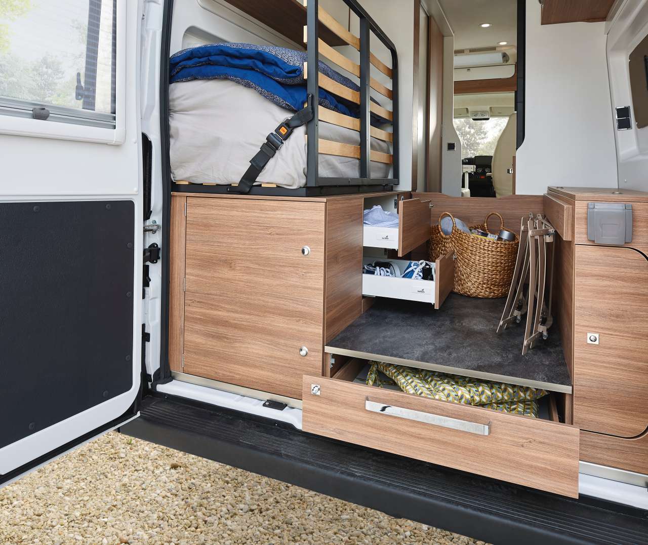 Le constructeur des Pays-de-la-Loire décline une suite d’aménagements assez classiques, au nombre de six, en une multitude de variantes (jusqu’à 4 par modèle) et de finitions (Standard ou Premium) ; soit, au total, une trentaine de propositions, sans compter les packs et options… Bref, chacun pourra trouver, voire composer à la carte, le véhicule qui lui ressemble. Cette stratégie n’exclut pas des originalités, comme le V 600 J2, équivalent du Bavaria K 600 J2.