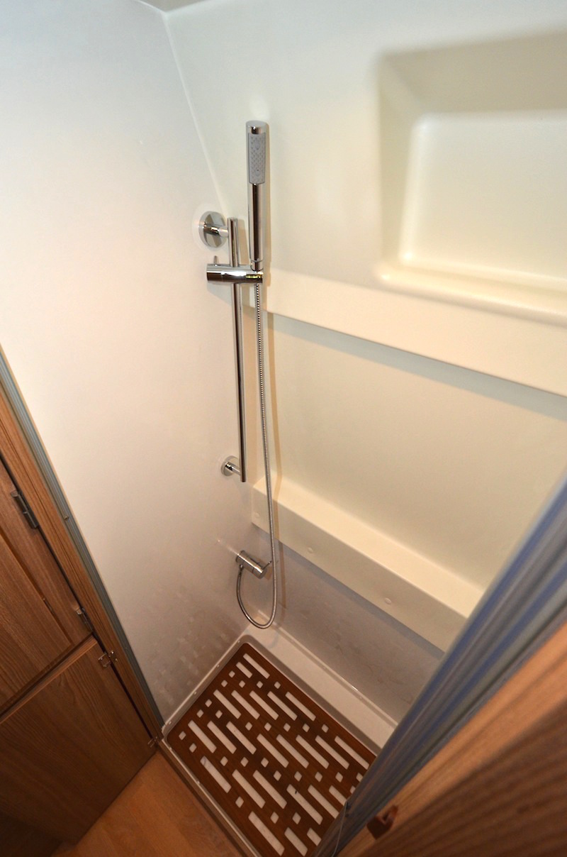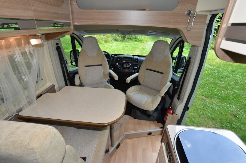 Rapido fait encore plus fort avec ce V55. Et pour ajouter à la comparaison avec les cellules, une cloison articulée assure une séparation jour / nuit en même temps qu’elle réunit les deux espaces de toilette : la douche d’un coté et le coin toilette de l’autre.