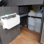 Au centre, ce fourgon Iroise propose une banquette Scopema 2 places (version 3 places disponibles en option) avec accoudoirs et appuie-têtes réglables en hauteur. Une banquette qui pourra être converti en mode nuit en un grand couchage double (193 x 135/112cm). Logés sous la banquette, un coffre pour le WC chimique (inclus de série avec la poubelle) et un profond tiroir sont disponibles. Côté prestations dans l’habitacle, si le chauffage stationnaire est en option (+1750€), on retrouve de série un petit frigo Waeco 49L., un robinet-douchette (pour l’extérieur), deux jerricans d’eau de 20L. ou encore 5 spots d’éclairages.