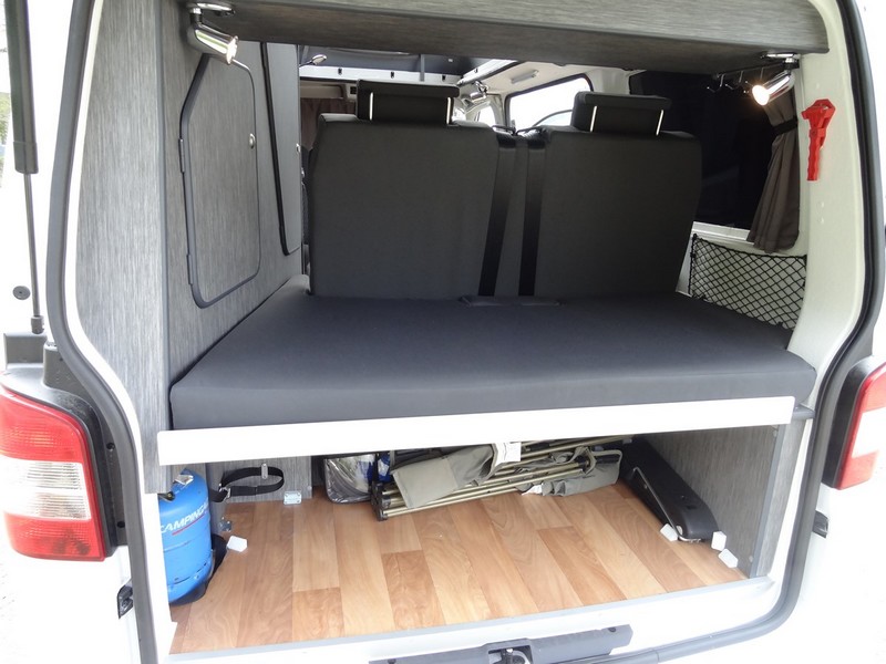 Notez qu’on a ici la possibilité é d’extraire la partie arrière du couchage (sommier + matelas) pour libérer le coffre. C’est bien vu. Autre bon point : le WC portable reste disponible même lorsque le lit est fait.