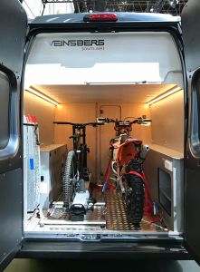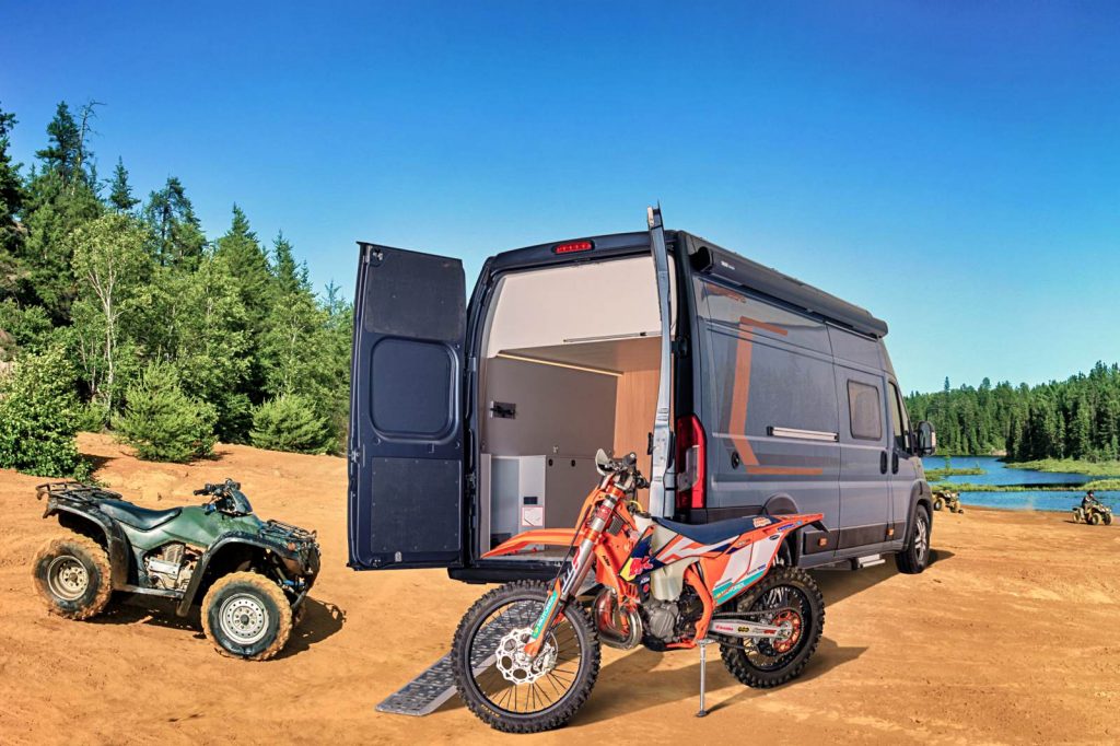 L’Outlaw offre un véritable abri aux deux roues qui évitent les contraintes d’un transport sur remorque. A l’intérieur, le constructeur a pris soin de rendre étanche la séparation entre le garage et l’habitacle du fourgon. Avec une porte rendue hermétique aux passages d’airs et aux émanations d’essence, ou odeurs mécaniques.