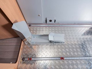 Weinsberg a disposé deux rangées de mobilier de chaque côté du garage pour les accès techniques, des compartiments permettent de ranger bottes ou casque. Contre la paroi un emplacement est prévue pour fixer la rampe d’accès repliée.