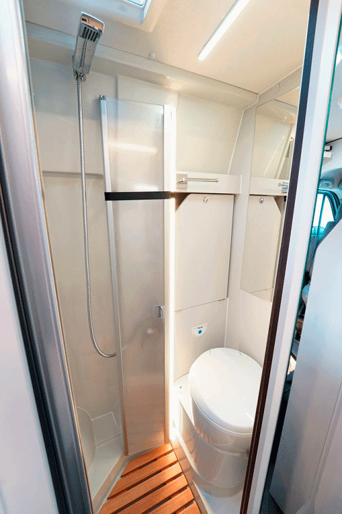 Souvent réduit à la portion congrue à bord des fourgons, le cabinet de toilette réclame des solutions astucieuses pour assurer un usage dans le plus grand confort. Adieu le rideau de douche qui colle à la peau et qui reste humide. Grâce au W.-C. pivotant et au lavabo rabattable de la nouvelle salle de bain TB Concept, Font Vendôme parvient à libérer l’espace douche de tout encombrement et l’équipe d’une porte pliante rigide. Un vrai plus, notamment sur une longueur aussi réduite que celle du Master Van XS.