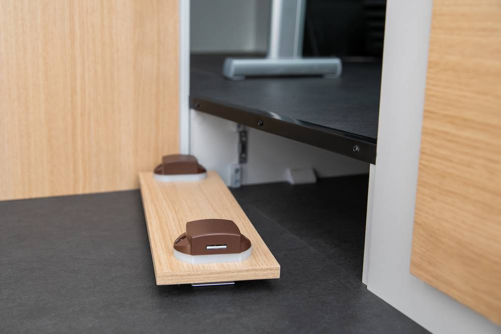 En plus de la soute, compartimentée par un plancher amovible, de précieux rangements sont accessibles un peu partout : très large penderie en pied de lit, placards de pavillon à l’arrière, tiroirs en cuisine, logement sous l’estrade du salon, etc. Comme l’ensemble des fourgons Font-Vendôme, ce modèle familial s’affranchit au maximum du gaz et mise sur le carburant moteur pour alimenter la chaudière Truma 4. C’est un bon atout pour la charge utile (+ de 500 kg) et si vous partez loin, souvent et hors saisons.