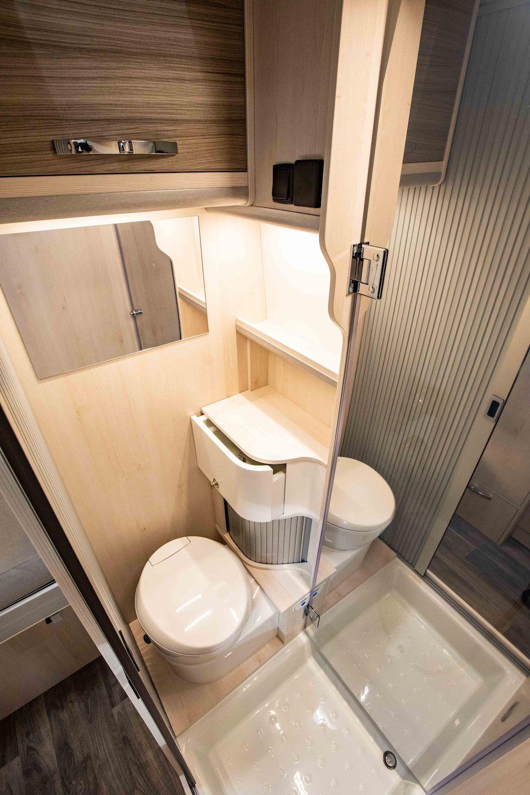Le compartiment dédié à la salle d’eau, derrière le siège conducteur, adopte en revanche quasiment la même configuration. Au choix et sans surcoût, la vasque d’angle peut-être fixe (ci-dessous) ou incorporée à un tiroir (voir galerie du 540).