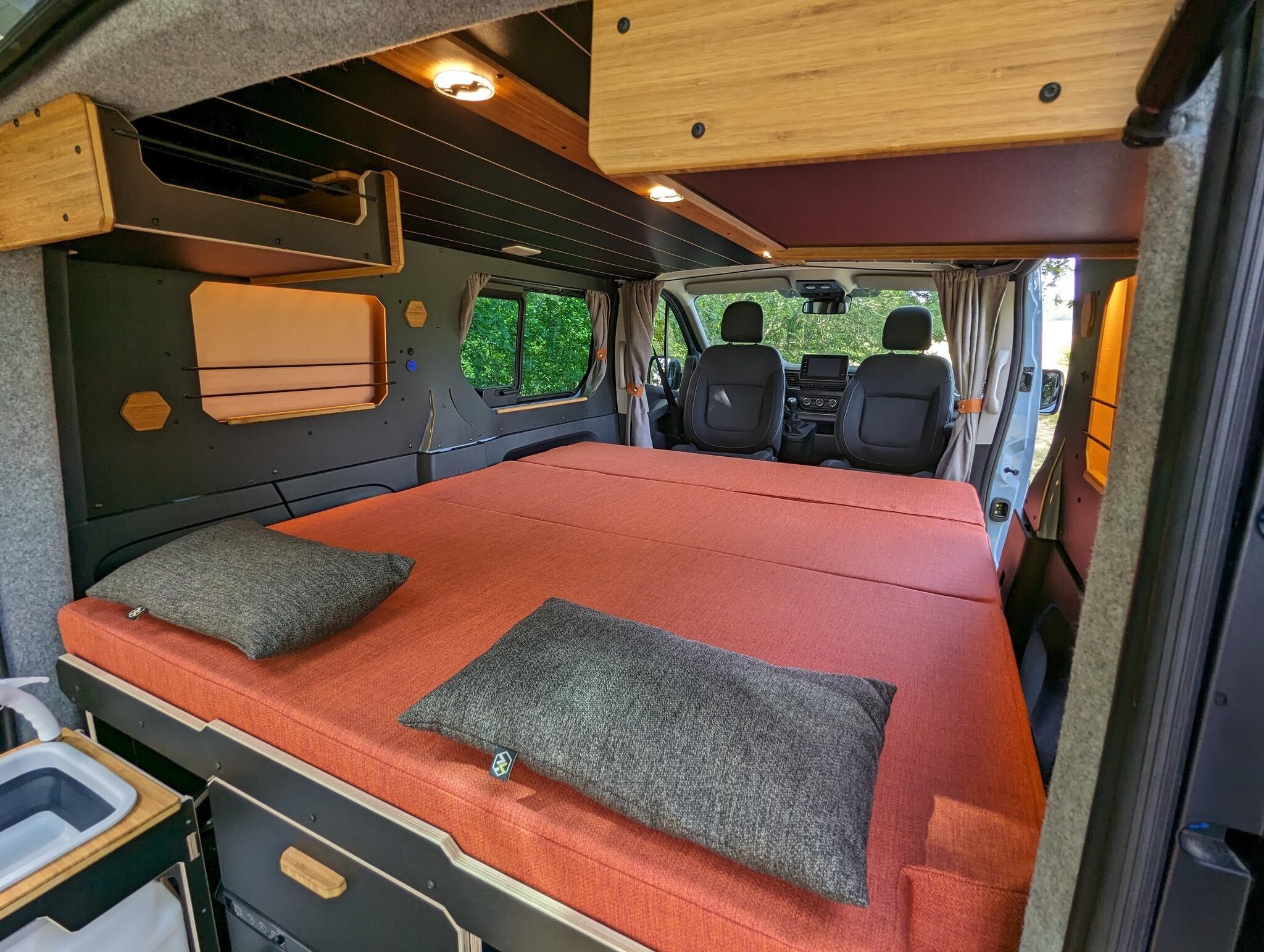 Un certain nombre d’équipements sont proposés en option pour augmenter le niveau d’autonomie et/ou de confort. Parmi lesquels, un réfrigérateur tiroir (650 €) associé à une batterie (1000 à 1800 €), un kit de panneaux solaires (600 €), l’eau chaude (600 €), etc.