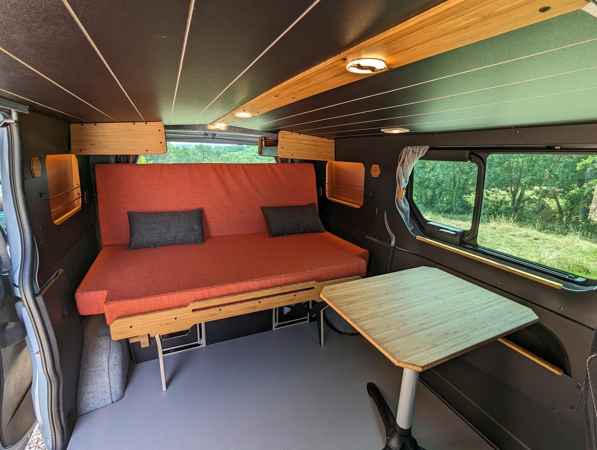 Dans sa version « nue » (2500 €), la Box inclut un caisson vide que vous pourrez aménager comme bon vous semble, un couchage de 150 x 190 cm avec matelas 10 cm d’une densité de 35 kg/m3 et une table avec trépied et pied pour une utilisation intérieure ou extérieure.