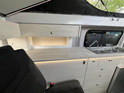 A la différence d’un VW California, dont le meuble colonne coupe la perspective et réduit la surface de pose en cuisine, JCG Créations présente une astucieuse lingère sur coulisses à commande électrique. Rien de moins ! Pour les visiteurs au Camper Van Week-End, la surprise est totale. Chacun salue cette bonne idée qui modifie totalement la perception intérieure et multiple la surface de travail. C’est malin et totalement inédit dans un combi-van.