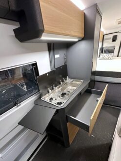 Enfin ce modèle profite toujours des dernières innovations de la saison. Notamment le nouveau matériau composite en polypropylène expansé EPP, léger, isolant et très résistant, utilisé pour les placards de pavillon avant. Leur conception moulée sur mesure permet d’agrandir le volume de rangement. On retrouve également la nouvelle table dinette, au plateau fin et robuste avec rallonge de table et porte-gobelet indépendant. Côté cuisine, on profitera d’une jolie planche à découper en bois, siglée « 60 ans ».